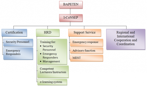 The Act No. 10 year 1997 on Nuclear Energy establishes clear separation between promoting and regulating activities. It also provides the mandate to the regulatory body to ensure safe, secure and peaceful use of nuclear energy. BAPETEN as the regulatory body of Indonesia takes the leading role in addressing the existing and future threats and risks related to nuclear material and other radioactive material and associated facilities and associated activities. BAPETEN shall coordinate national efforts to enhance the required national infrastructure to establish and sustain nuclear security and emergency preparedness and response. The Indonesia Centre of Excellence on Nuclear Security and Emergency Preparedness (I-CoNSEP) is therefore established to reflect the national commitment to fulfil the safety, security, and safeguards aspects in the use of nuclear energy.